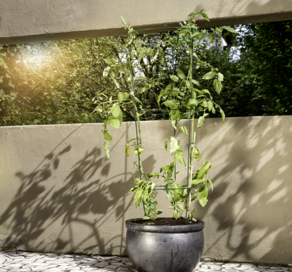 Gradually vertically opening climbing and support tower for vine plants of all kind. Easy to use. Round plant containers are the ideal location, although there is nothing to be said against using the support tower elsewhere. There are no limits to your creativity. Strong structure due to the coated steel core.