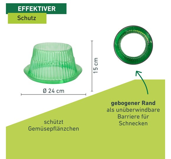 Schnecken-Schutzringe stellen für Schnecken eine unüberwindbare Barriere dar und schützen somit Ihre Pflanzen vor Schädlingsfraß. Die feinen Pflanzentriebe von Jungpflanzen sind bei Schnecken besonders beliebt und sind außerdem empfindlicher gegen Frost. Gut, dass ein Schneckenschutzring gleich doppelt schützt. Er stellt nämlich nicht nur eine Barriere gegen Schnecken dar, sondern erzeugt zusätzlich ein Schonklima für die Pflanzen, welches ganz unabhängig von der Witterung ist. Der obere Rand ist nach unten gebogen und ermöglicht so ein gezielteres Gießen.