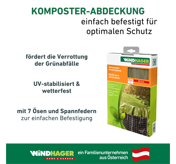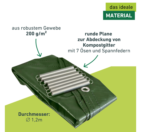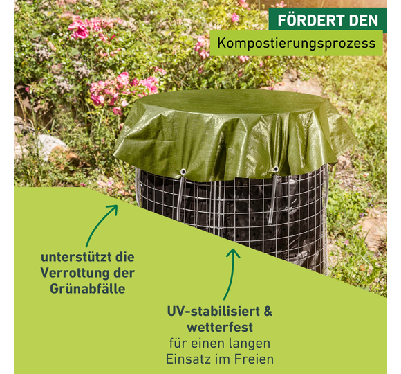 Aus robustem Gewebe (200 g/m²), fördert die Verrottung der Grünabfälle. UV-stabilisiert und wetterfest. 7 Ösen, inklusive Spannfedern.