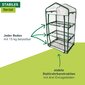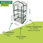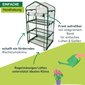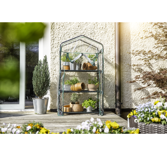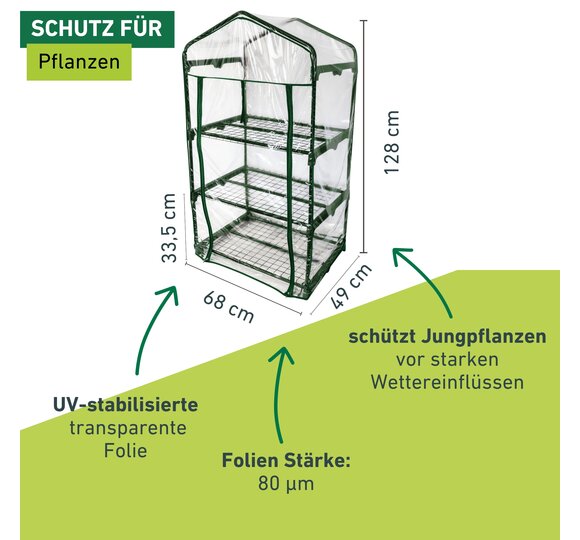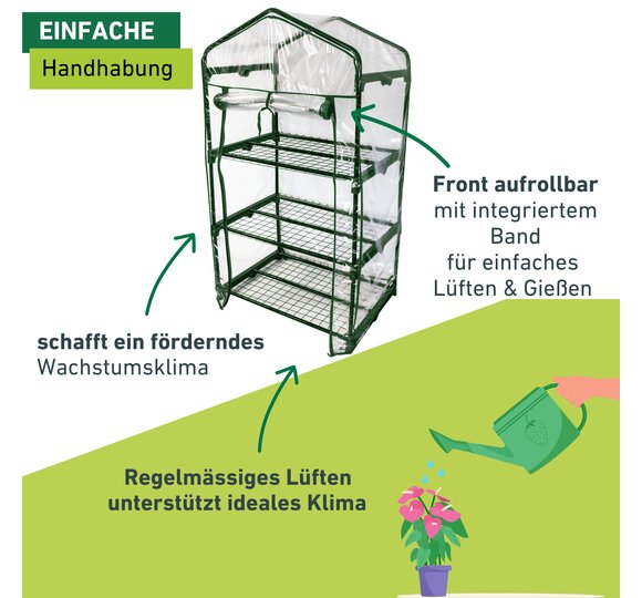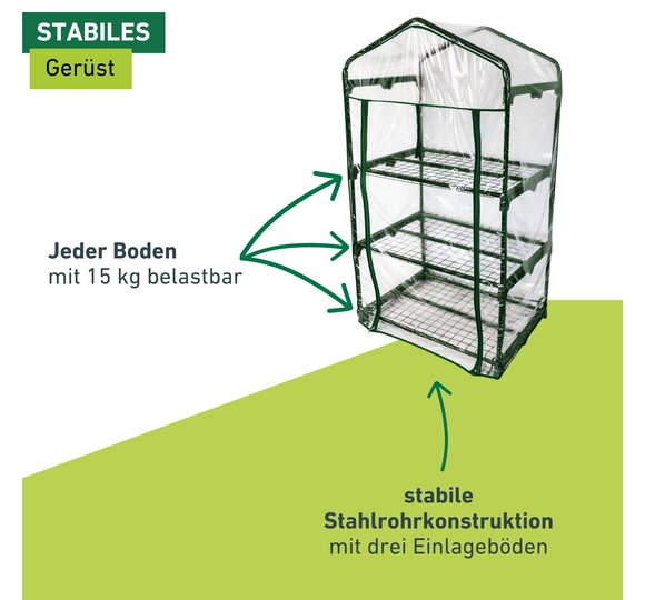 Die darin erzeugten treibhausklimatischen Bedingungen sind die optimalen Voraussetzungen für ein gedeihliches Wachstum Ihrer Pflanzen. In diesem Gewächshäuschen sind Ihre Pflanzen Wind und anderen Wettereinflüssen nicht mehr schutzlos ausgeliefert. Der Stahlrohr-Rahmen und die drei Einlegeböden ergeben eine stabile Konstruktion. Einfach in der Montage lässt es sich in nur wenigen Schritten zusammenzubauen und schon können Sie Ihre Pflanzen in ihr neues Heim übersiedeln. Die Folienhülle kann frontseitig durch zwei Reißverschlüsse problemlos geöffnet und am oberen Ende mittels Band fixiert werden.