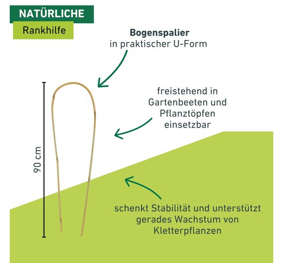 Mit dem modernen Bambus Bogenspalier können besondere Akzente im Garten, auf der Terrasse und am Balkon gesetzt werden. Die naturfarbene Rankhilfe ist freistehend nutzbar und daher optimal für Gartenbeete oder Blumentöpfe geeignet. Einfach in die Erde gesteckt, gibt sie kletterfreudigen Pflanzen Halt und ermutigt sie somit zu geradem Wachstum.