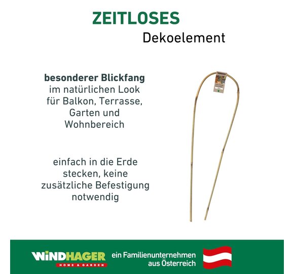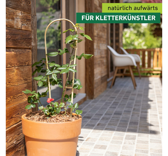 Mit dem modernen Bambus Bogenspalier können besondere Akzente im Garten, auf der Terrasse und am Balkon gesetzt werden. Die naturfarbene Rankhilfe ist freistehend nutzbar und daher optimal für Gartenbeete oder Blumentöpfe geeignet. Einfach in die Erde gesteckt, gibt sie kletterfreudigen Pflanzen Halt und ermutigt sie somit zu geradem Wachstum.