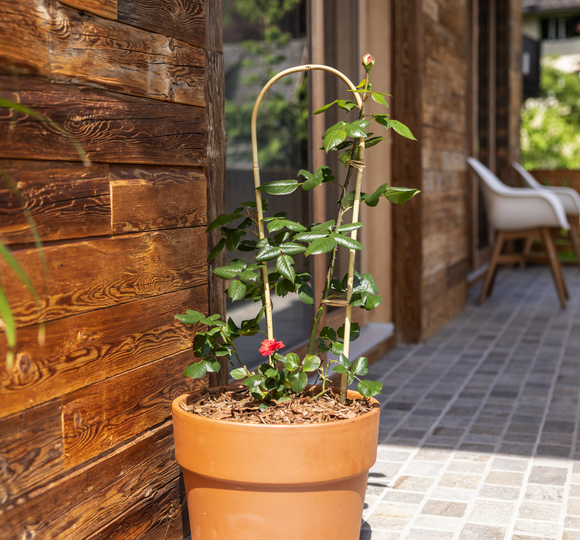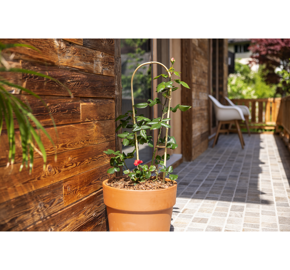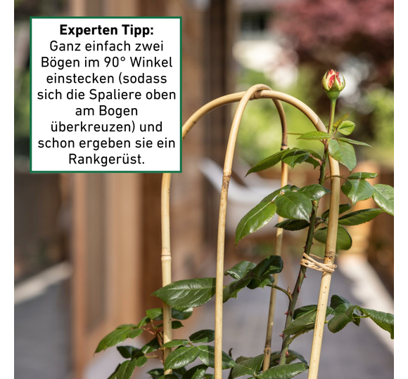 Unser Tipp: Ganz einfach zwei Bögen im 90° Winkel einstecken (sodass sich die Spaliere oben am Bogen überkreuzen) und schon ergeben sie ein Rankgerüst.