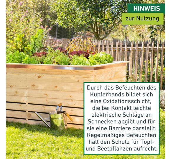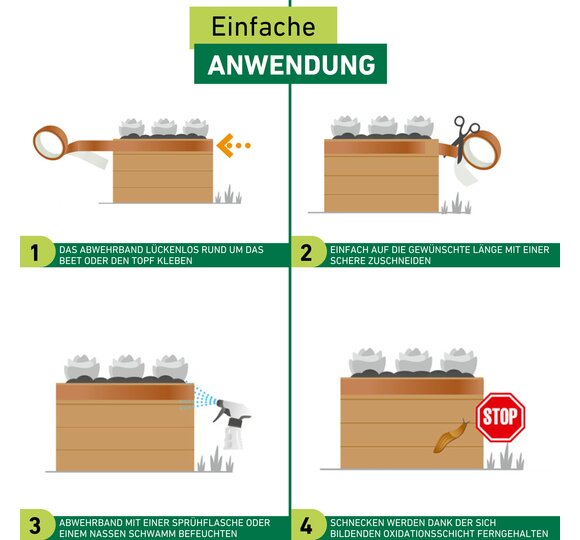 Das praktische Kupferband ist bereits mit einer selbstklebenden Oberfläche ausgestattet und kann direkt am Topf, Früh- oder Hochbeet befestigt werden. Das Schnecken Abwehrband kann ganz leicht mit der Schere auf das gewünschte Maß gekürzt werden. Die Klebeoberfläche haftet sowohl auf glatten als auch auf rauen Oberflächen. Wichtig ist, dass Sie das Kupferband lückenlos rund um Hochbeet oder Pflanztopf kleben. Danach muss das Band nur noch gut befeuchtet werden. Das funktioniert am besten mit einer Sprühflasche oder einem nassen Schwamm. Auf diese Weise bildet sich die Oxidationsschicht, die die Schnecken von Ihren Pflanzen fernhält. Befeuchten Sie das Kupferband regelmäßig.