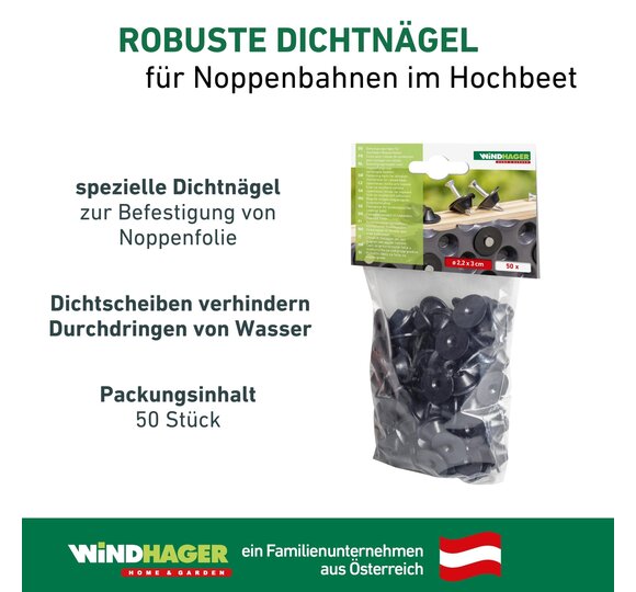 Mit den robusten Dichtnägeln von Windhager lassen sich Noppenfolien sicher in Hochbeeten befestigen, die so von innen vor Nässe geschützt werden. Der Nagel aus gehärtetem und verzinktem Stahl hält optimal in Untergründen wie Holz. Die Unterlegscheibe aus Kunststoff sorgt dafür, dass die Montagestelle gut abgedichtet wird und kein Wasser durchdringt.
