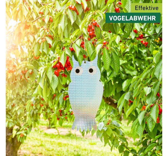Frische Kirschen oder Beeren sind nicht nur bei uns Menschen beliebt. Auch Vögel bedienen sich gerne an den süßen Früchten und räumen häufig so manchen Obstbaum leer. Diese Reflektoren schrecken die Vögel ab, denn sie werden von dem sich spiegelnden Licht geblendet und in die Flucht geschlagen. Beide Seiten der dekorativen Eulen sind mit einer reflektierenden Oberfläche ausgestattet und drehen sich im Wind – für noch effektivere Wirkung.