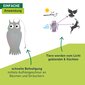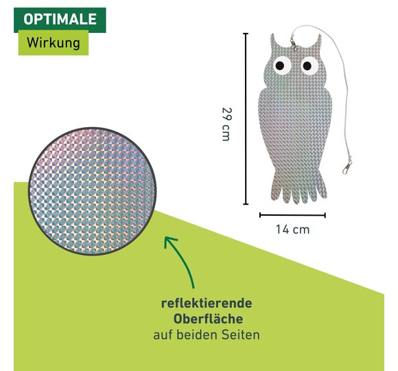 Die Eulen kommen im praktischen Doppelpack und müssen nur noch mittels der bereits befestigten Aufhängeschnur an Zweigen aufgehängt werden. Wichtig ist, dass die Reflektoren frei hängen, damit sie sich im Wind bewegen können. Nur so kann die Vogelabwehr ihre volle Wirkung entfalten.