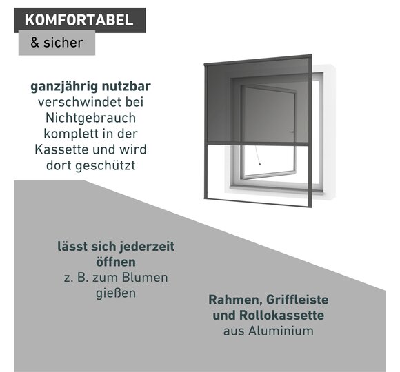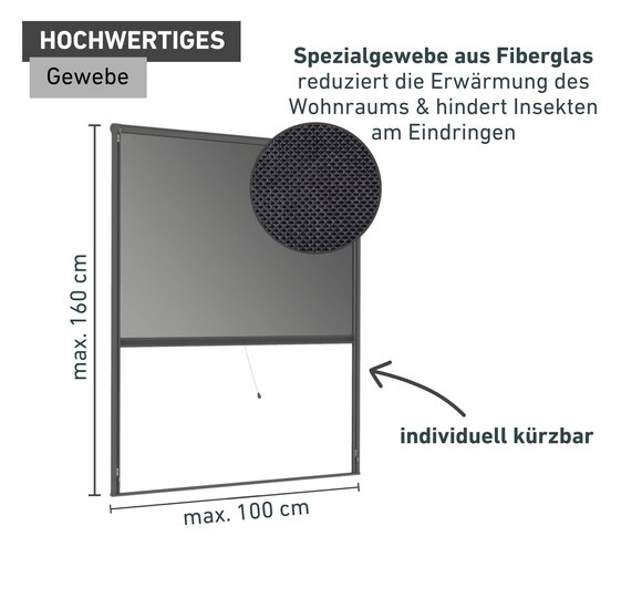 • COOL und SAFE - Hitze und Mücken bleiben auch bei geöffnetem Fenster ausgesperrt. Das schwarze Spezialgewebe aus Fiberglas reduziert die Erwärmung des Wohnraums und hindert Insekten am Eindringen. Die Durchsicht nach draußen ist jedoch einwandfrei.
