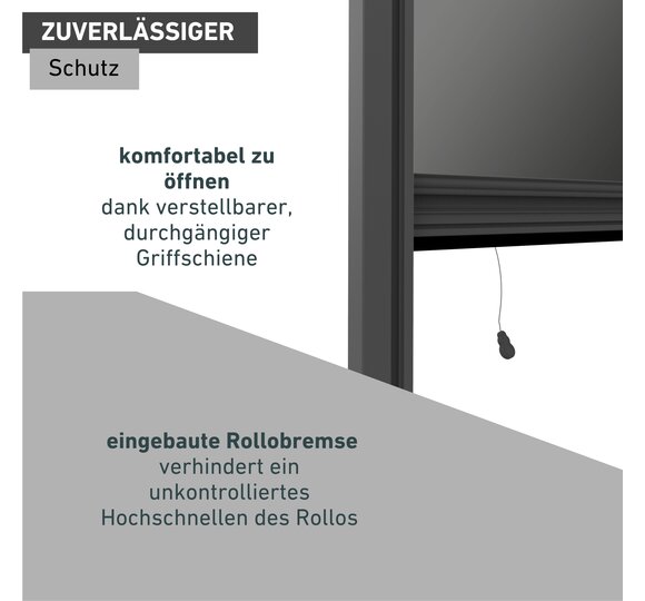 • BENUTZERFREUNDLICH IM ALLTAG – Komfortabel zu öffnen dank verstellbarer, durchgängiger Griffschiene. Die eingebaute Rollobremse verhindert ein unkontrolliertes in die Höhe schnellen. Verschwindet platzsparend in der Rollokassette bei Nichtgebrauch.