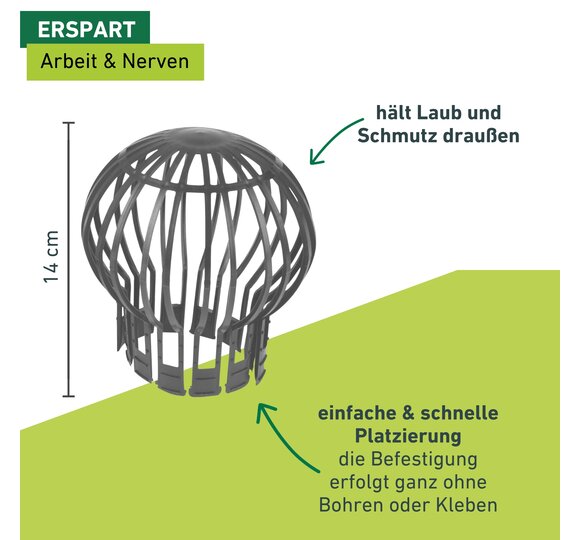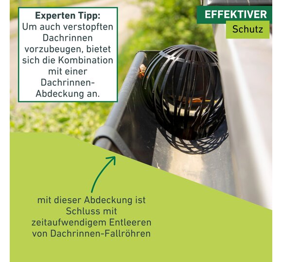 Hinweis: Um auch verstopften Dachrinnen vorzubeugen, bietet es sich an, die Fallrohr-Abdeckung mit einer Dachrinnen-Abdeckung zu kombinieren (Art.-Nr.: 07125)