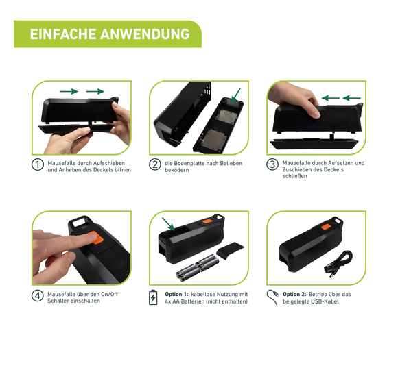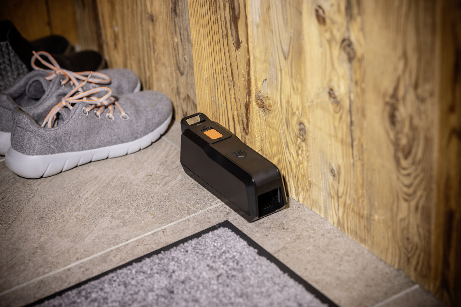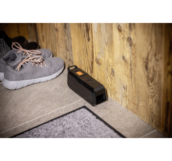 Deshalb ist es wichtig, frühzeitig zu handeln. Hier kommt wirkungsvolle Technik zum Einsatz: Die elektronische Mausefalle bekämpft Mäuse in Sekunden mithilfe eines elektrischen Schlags, sobald beide Kontaktplatten im Inneren durch das Tier berührt werden. Ein automatisches Licht- und Tonsignal bestätigt im Anschluss den Fangerfolg. Ob im Keller, auf dem Dachboden oder in der Waschküche, die elektronische Mausefalle lässt sich flexibel entlang der Laufwege der Mäuse platzieren, selbst an sehr schmalen Stellen. Sie kann über das mitgelieferte USB-Kabel oder kabellos mit 4x AA Batterien (nicht inklusive) betrieben werden und ist damit überall einsatzbereit.