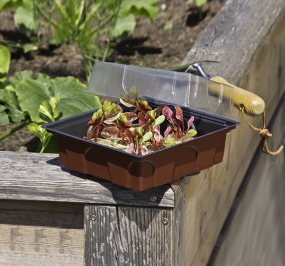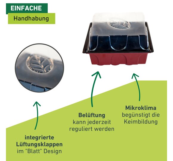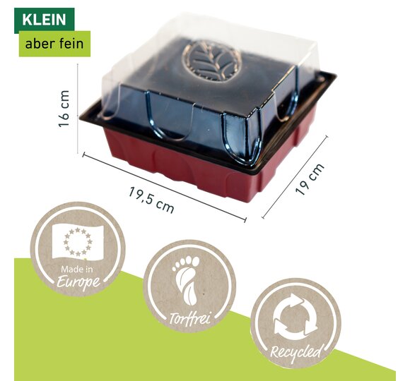 Die recycelte Kunststoffschale mit Klarsichthaube und Lüftungsschlitzen in Blattform schafft optimale Bedingungen für die Jungpflanzenanzucht in Innenräumen. Inklusive torffreier Quelltabs, in die Samen direkt eingepflanzt werden können.