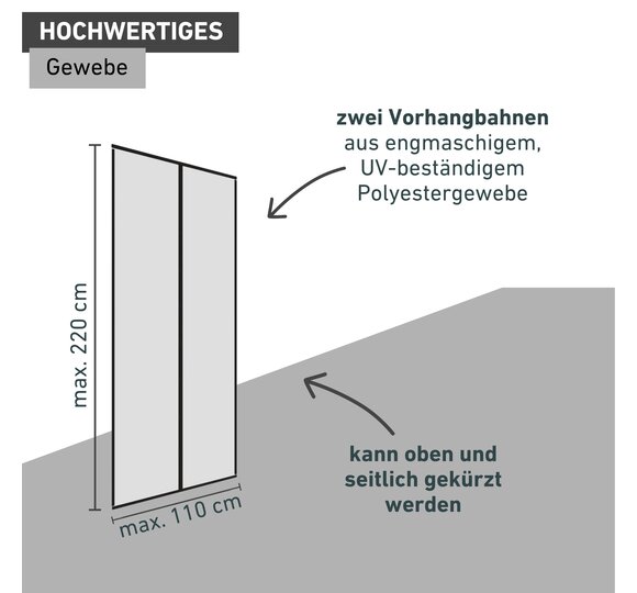 Der Fliegengitter Türvorhang hat 2 überlappende Lamellenbahnen, welche aus schwarzem Polyestergewebe bestehen. Unsichtbar eingearbeitete Magnetstreifen sorgen für ein sicheres und geräuschloses Schließen des Vorhangs. Bei Bedarf kann das Gewebe oben und seitlich gekürzt werden; der untere Rand ist für einen optisch schönen Abschluss bereits gesäumt.