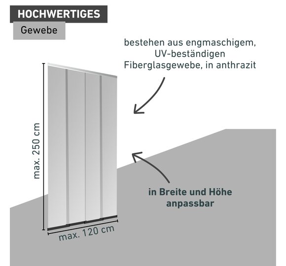- HOCHWERTIGES MATERIAL – Die einzelnen Vorhangbahnen bestehen aus engmaschigem, UV-beständigen Fiberglasgewebe, in anthrazit. Beschwerungsleisten halten den Vorhang straff, „Soft Stop“-Kappen sorgen für geräuschloses Schließen. Die durchgängige, beschichtete Aluminiumleiste bietet dem Insektenschutz festen Halt am Türrahmen.