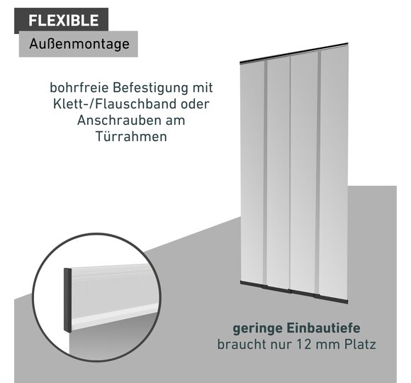 - EINFACHE AUßENMONTAGE AUF 2 ARTEN – Bohrfreie Befestigung mit Klett-/Flauschband oder Anschrauben am Türrahmen. Platzbedarf für den Einbau: 12 mm. Passt auch für gängige Terrassen- oder Balkontüren mit Rollladen.