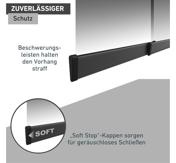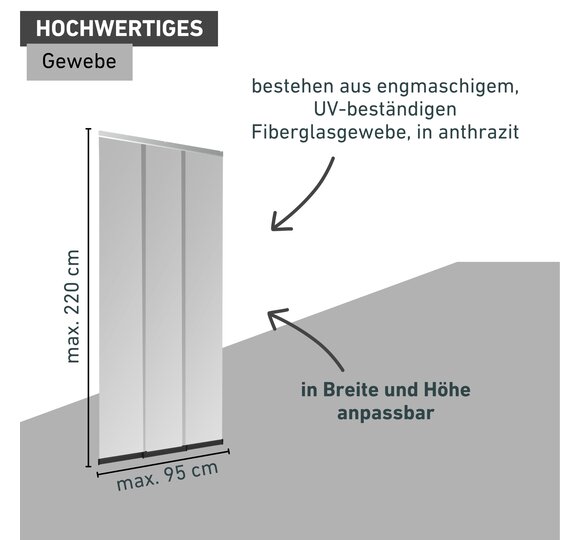 • HOCHWERTIGES MATERIAL – Die einzelnen Vorhangbahnen bestehen aus engmaschigem, UV-beständigen Fiberglasgewebe, in anthrazit. Beschwerungsleisten halten den Vorhang straff, „Soft Stop“-Kappen sorgen für geräuschloses Schließen. Die durchgängige, beschichtete Aluminiumleiste bietet dem Insektenschutz festen Halt am Türrahmen.