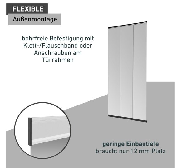 • EINFACHE AUßENMONTAGE AUF 2 ARTEN – Bohrfreie Befestigung mit Klett-/Flauschband oder Anschrauben am Türrahmen. Platzbedarf für den Einbau: 12 mm. Passt auch für gängige Terrassen- oder Balkontüren mit Rollladen.