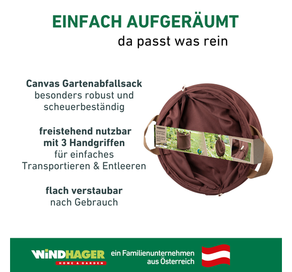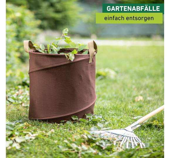 Beim Arbeiten im Garten hat man oft alle Hände voll – und dann auch noch den Abfallsack aufhalten zu müssen, kommt meist sehr ungelegen. Deshalb hat der Canvas Sack ein praktisches Pop-Up System und steht dank Spirale von alleine, damit Äste und Laub einfach reingeworfen werden können.