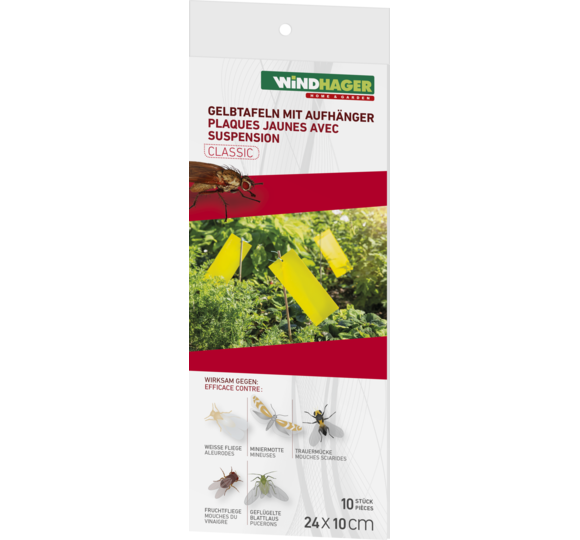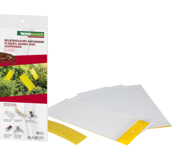 Die 24x10 cm großen Tafeln sind bereits gebrauchsfertig beleimt und dank vormontiertem Aufhängedraht sofort einsatzbereit. Vor der Anwendung muss nur noch die Folie abgezogen werden, um die Tafeln anschließend direkt am gewünschten Einsatzort anzubringen. Die Tafeln am besten auf einem Stab befestigen und neben den Pflanzen in die Erde stecken. Es können auch mehrere Gelbtafeln, in einem Abstand von 30 cm, angebracht werden.