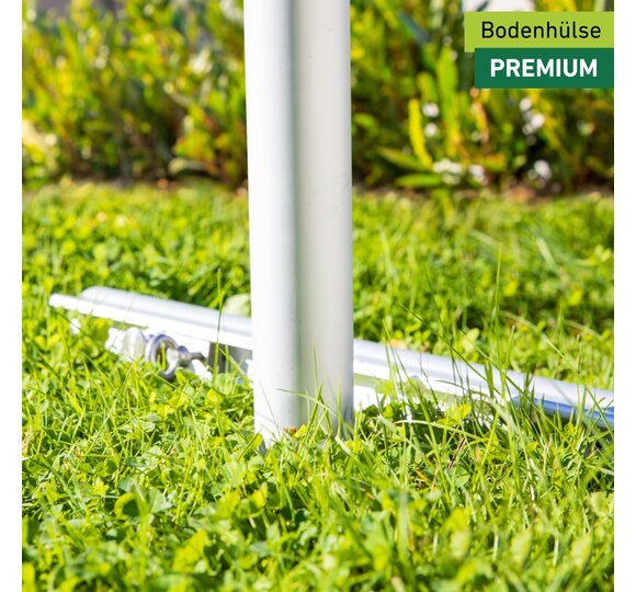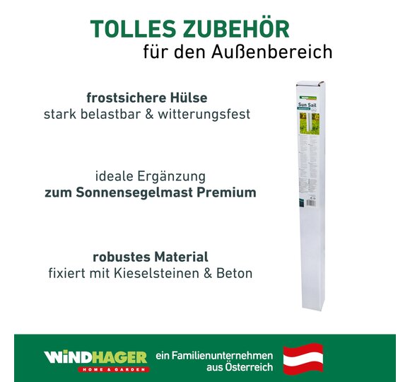 Eingebettet in ein Betonfundament ist die Bodenhülse Premium die ideale Ergänzung zum Sonnensegelmast Premium. Die Bodenhülse kann auch bei starker Belastung ein Sonnensegel stark straffen.