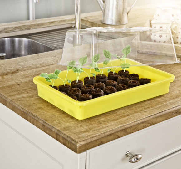 Die Haube passt perfekt auf eine grüne (05583), gelbe (05584) oder naturfarbene (05847) Aussaatschale von Windhager - und im Handumdrehen entsteht ein stabiles Zimmergewächshaus für die Fensterbank.