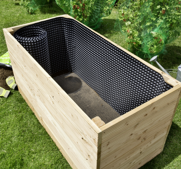 So einfach geht's: Die reißfeste Noppenfolie lässt sich unkompliziert auf die passende Größe zuschneiden und kann flexibel über Ecken und Kanten im Beet gebogen werden. Wichtig dabei ist, dass die Noppen nach außen zum Holz zeigen.