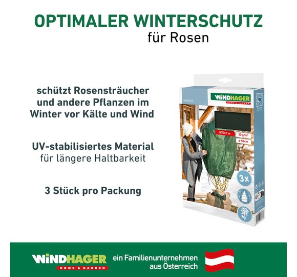 Eine Rosenvlies-Haube hilft dabei, Rosen und andere Pflanzen im Garten während der kalten Jahreszeit vor Frost und Wind zu schützen. Im späten Herbst, kurz bevor der Winter einkehrt, gilt es die Pflanzen gut einzupacken. Zweige und sperrige Pflanzen können, vor der Anbringung des Winterschutzes, mit einer Schnur, wie zum Beispiel dem Kokos-Baumanbinder von Windhager, zusammengebunden werden. Danach klappt das Anbringen schnell und unkompliziert. Bei Kübelpflanzen sollte auch der Topf geschützt werden. Das funktioniert schnell und unkompliziert mit dem Windhager-Topfschutz. Für rundum gut geschützte Pflanzen können Sie den Topf zusätzlich auf eine Topfunterlage stellen.