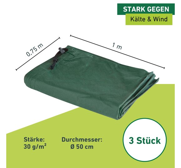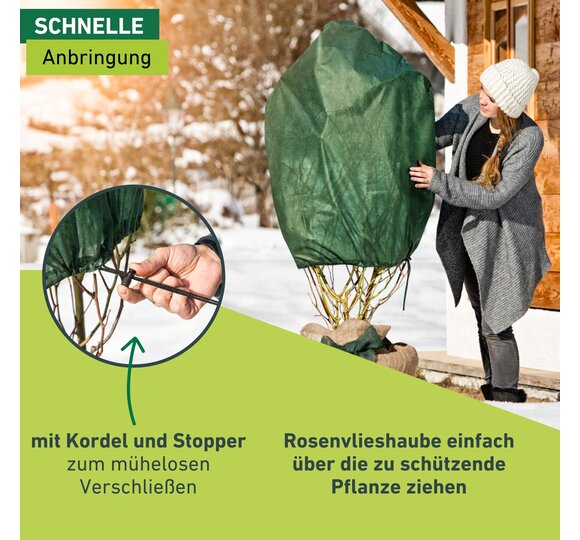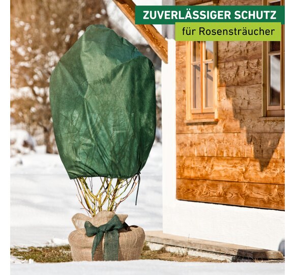 Weil Freiland-Rosensträucher die kalte Jahreszeit nicht an einem temperierten Ort verbringen können, müssen sie im Garten gut vor Kälte und Wind geschützt werden. Diese Rosenvlieshaube wird einfach über die zu schützende Pflanze gezogen und anschließend mithilfe der Kordel verschlossen. So ist der gesamte Rosenstrauch bedeckt und der Winter kann kommen. In der Vlieshaube verdunstet das Wasser langsamer – so wird die Gefahr der Austrocknung der Pflanze durch Frost, Wind und Sonne verringert. Zudem ist das Rosenvlies UV-stabilisiert, was die Haltbarkeit des Produkts verlängert. Das Wintervlies kann neben Rosen auch als Winterschutz für viele andere Gartenpflanzen verwendet werden.