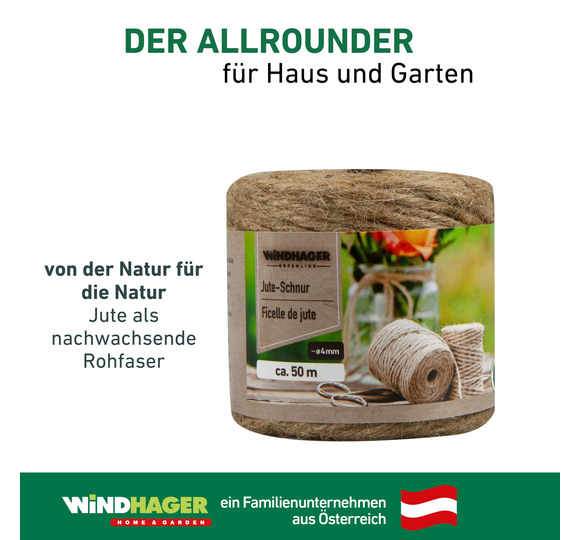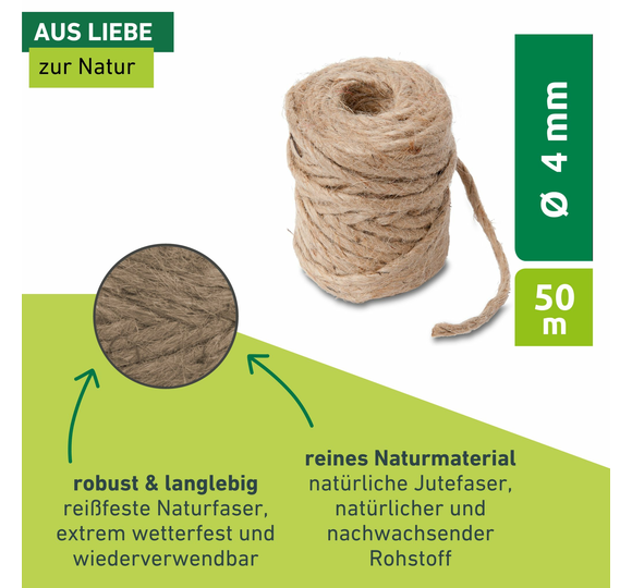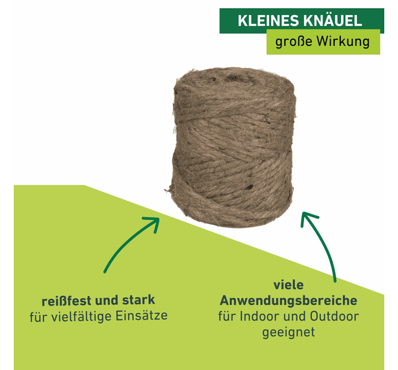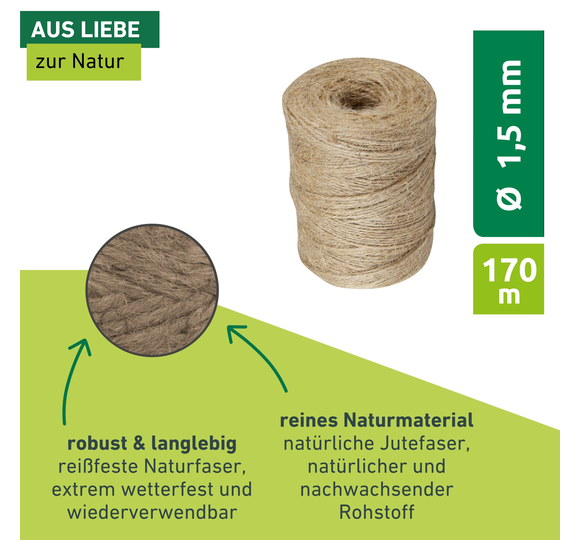 Die Schnur ist aus reißfester und witterungsbeständiger Jutefaser gefertigt. Pflanzen sowie unterschiedliche Materialien wie Matten, Vliese, Stäbe etc. können damit problemlos und sicher befestigt bzw. angebunden werden.