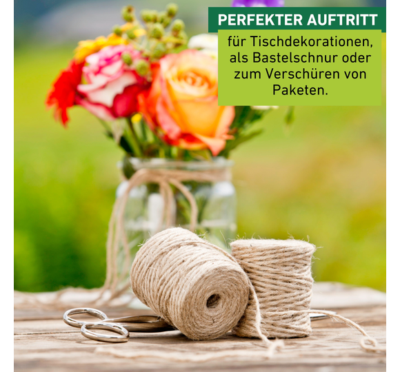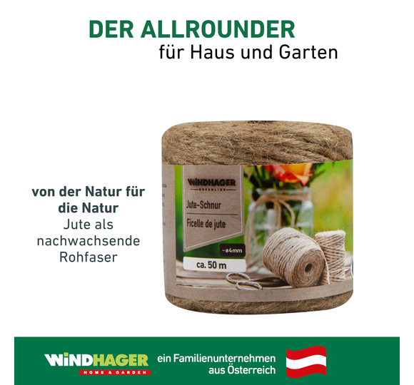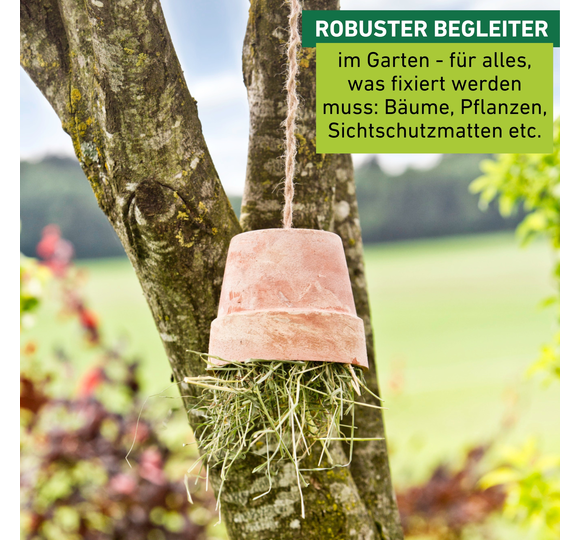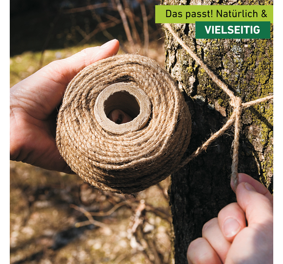 Die Schnur ist aus reißfester und witterungsbeständiger Jutefaser gefertigt. Pflanzen sowie unterschiedliche Materialien wie Matten, Vliese, Stäbe etc. können damit problemlos und sicher befestigt bzw. angebunden werden.