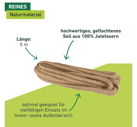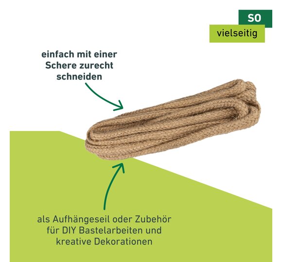 Der geflochtene Strick aus hochwertigen Jutefasern bietet unzählige Einsatzmöglichkeiten im Innen- und Außenbereich. Dank des strapazierfähigen, robusten Materials wird er zum nicht mehr wegzudenkenden Equipment von Gartenfreunden und Bastelbegeisterten.