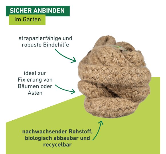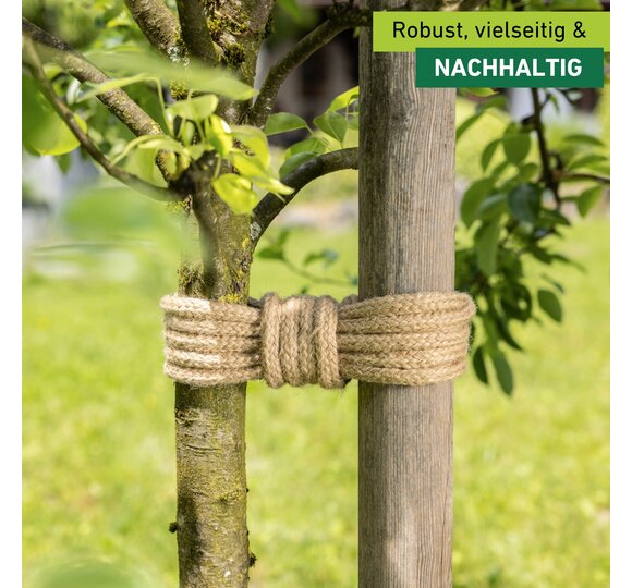 Als praktische Bindehilfe ist das Juteband ideal zur Fixierung von Bäumen oder zum Zusammenbinden von Ästen geeignet, um bei Wind und Wetter für den nötigen Halt zu sorgen. Seine natürliche Optik fügt sich außerdem dezent in das harmonische Gartenbild mit ein.