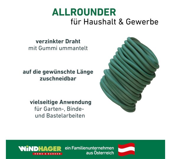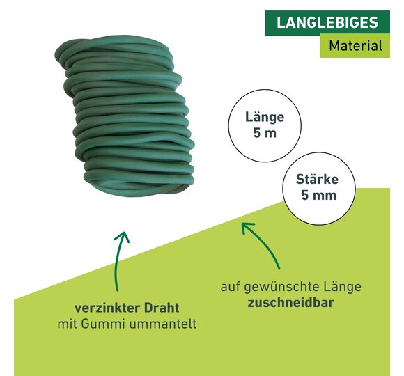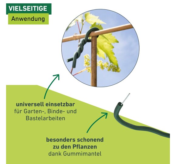 Mittels dieses verzinkten Drahts können empfindliche Pflanzen oder andere Gegenstände problemlos fixiert werden. Zusätzlich schützt der Gummimantel vor Verletzungen oder Beschädigungen. Praktisch und einfach in der Anwendung. Für den Einsatz im Innen- sowie Außenbereich geeignet.