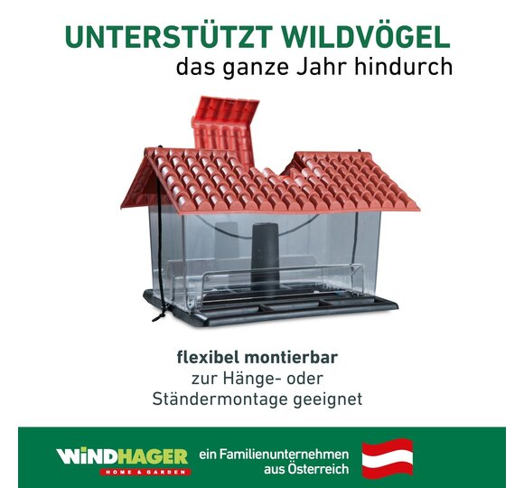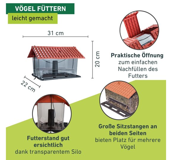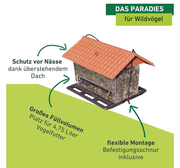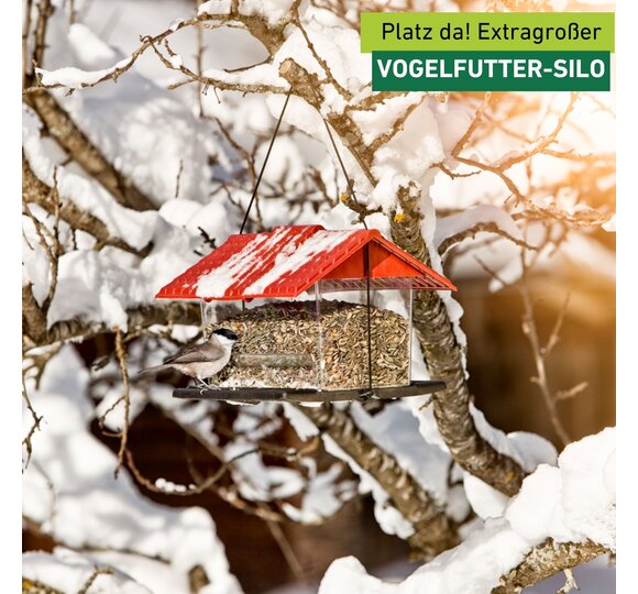 Das große Vogelfuttersilo „Ranch“ bietet mit einem Füllvolumen von 4,75 Liter eine großzügige Futterstelle für heimische Wildvögel. Das Haus kann ganz einfach über die Klappe am Dach mit Vogelfutter befüllt und an einer geeigneten Stelle angebracht werden. Sie können das Vogelhaus entweder an der Befestigungsschnur aufhängen oder an einem sicheren Ort hinstellen. Die fliegenden Besucher haben über eine breite Öffnung am unteren Ende des Hauses Zugang zum Futter, während sie es sich auf der Sitzstange bequem machen können. Das überstehende Dach schützt das Futter und die Vögel vor Nässe. Besonders praktisch: dank dem transparenten Kunststoffsilo ist jederzeit sichtbar, wann wieder Nachschub benötigt wird.