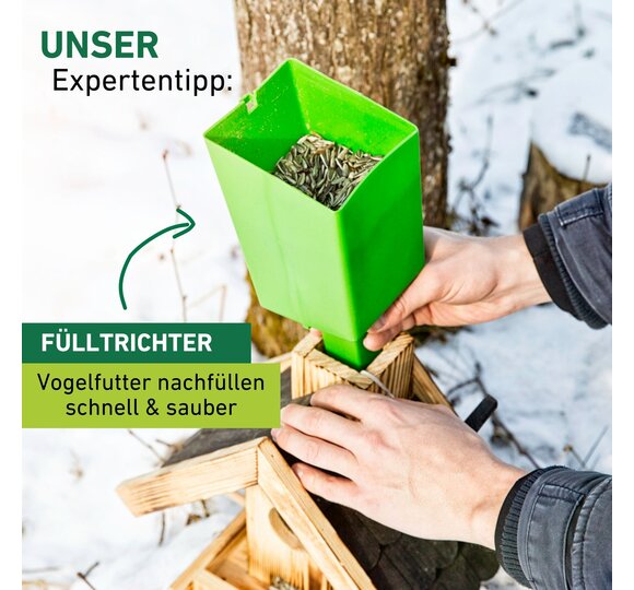 Tipp: Das Befüllen über die Klappe am Dach funktioniert am besten mit dem Fülltrichter von Windhager.