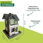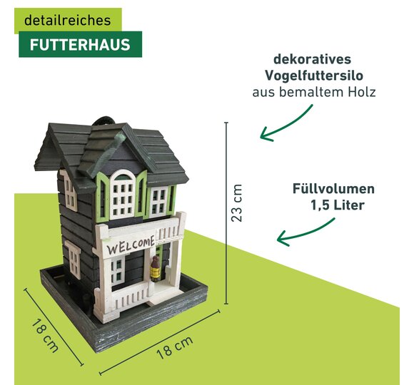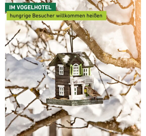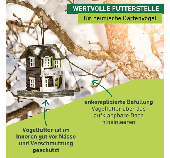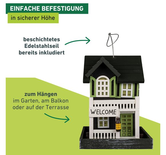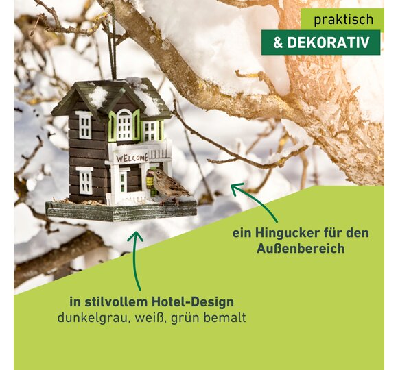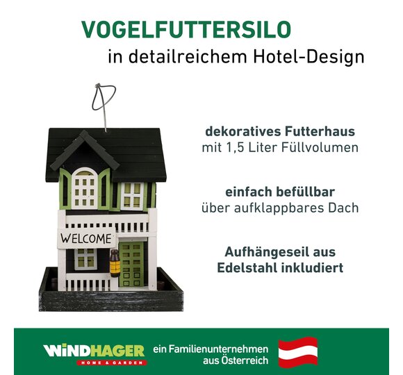 In diesem Hotel heißen Sie die bunte Vielfalt an heimischen Wildvögeln in Ihrem Garten willkommen. Das Vogelfutterhaus aus Holz ist mit liebevollen Details gestaltet und ein echter Hingucker im Garten, auf der Terrasse oder dem Balkon. Zur Befüllung mit Vogelfutter muss einfach nur das Dach aufgeklappt werden. Die clevere Silobauweise hat dabei einige Vorteile: einmal aufgefüllt, können sich die Vögel für lange Zeit am Futter bedienen, welches im Inneren gut vor Nässe und Verschmutzung durch Vogelkot geschützt bleibt. Um das Vogelhotel aufhängen zu können, ist im Lieferumfang ein robustes Edelstahlseil enthalten.