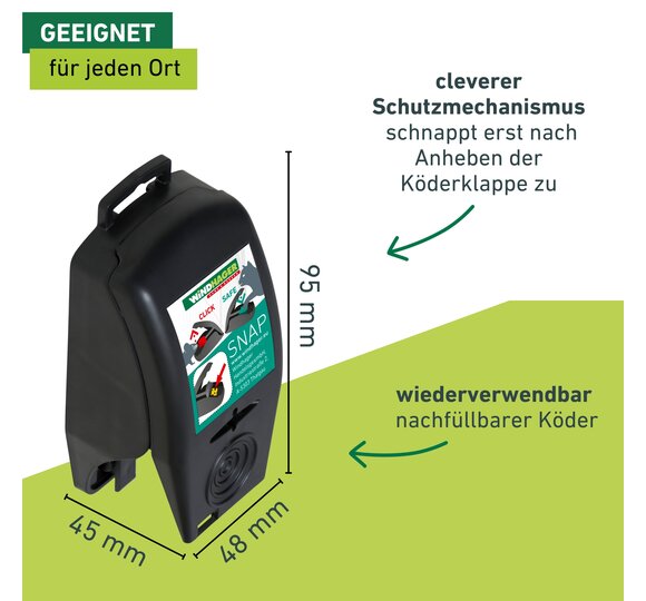 Die Mause- oder Rattenfalle SNAP muss nur mit einem Köder versehen werden, dann ist sie einsatzbereit. Durch den cleveren Schutzmechanismus schnappt die Falle erst zu, wenn die Maus die Klappe hochhebt, unter der sich der Köder befindet. So wird ein Zuschnappen verhindert, wenn zum Beispiel eine Katzenpfote in die Falle tapst.