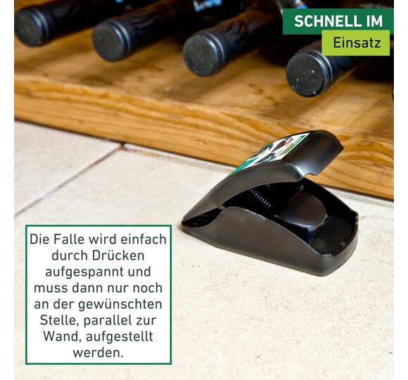 Die Falle wird einfach durch Drücken aufgespannt und muss dann nur noch an der gewünschten Stelle, parallel zur Wand, aufgestellt werden. Tappt eine Maus oder Ratte in die Falle, kann diese ganz unkompliziert entfernt werden, ohne dass das Tier direkt berührt werden muss. Den Kunststoff danach einfach reinigen - schon ist die Falle wieder einsatzbereit.