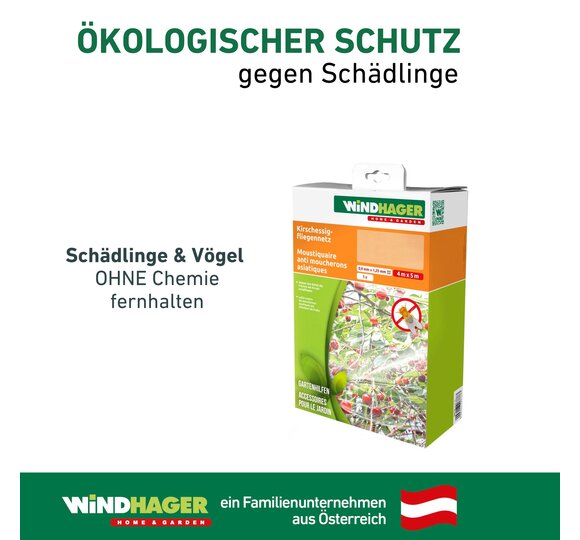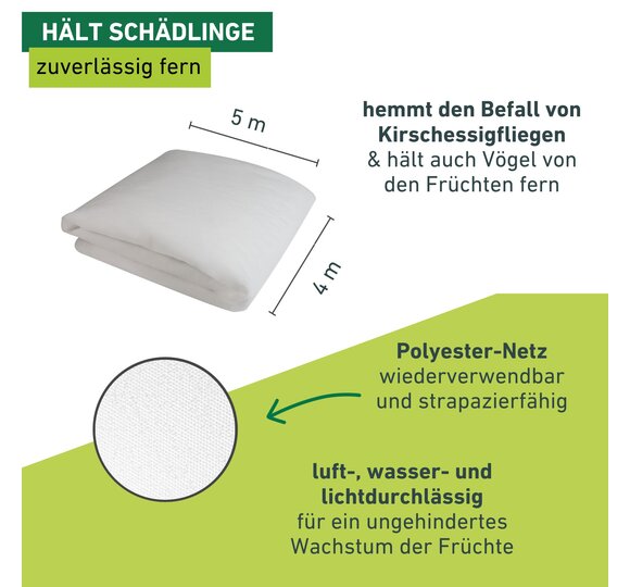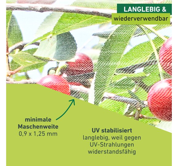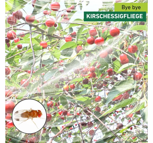 Der Befall von Obstbäumen und Sträuchern durch die Kirschessigfliege Drosophila suzukii wird effektiv gehemmt. Das feinmaschige Netz hemmt den lästigen Schädling darin, seine Eier in reifen Früchten abzulegen.