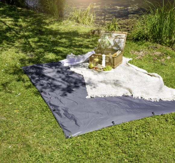 Die Plane ist mit Befestigungsschlaufen und einer Befestigungsschnur ausgestattet. Damit die Länge der Schnur individuell angepasst werden kann, sind im Set zehn Stück Leinenspanner enthalten. So ist sie direkt einsatzbereit und kann mit den mitgelieferten Heringen auch im Boden verankert werden.