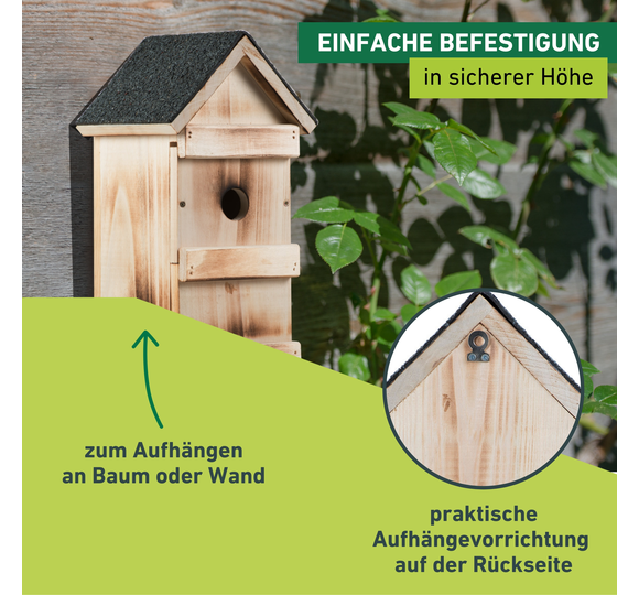 - INKLUSIVE AUFHÄNGEVORICHTUNG – An der Rückseite des Nistkastens befindet sich ein Haken zur Aufhängung