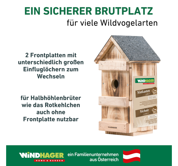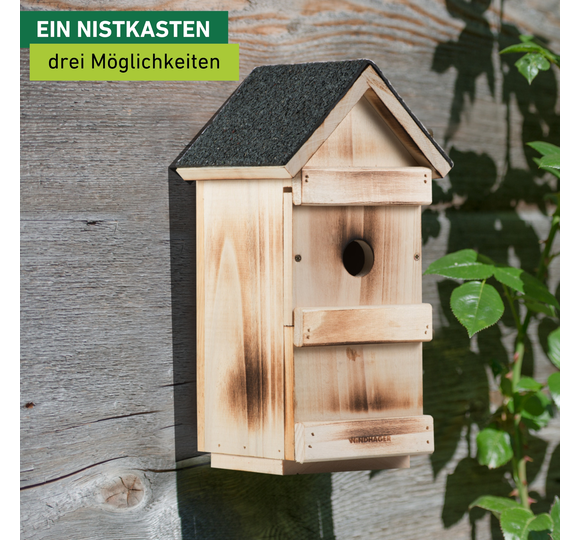 Die immer dichtere Bebauung und Abholzung von Wäldern führt dazu, dass es für Wildvögel immer schwieriger wird, einen geeigneten Nistplatz zu finden. Mit einem Nistkasten können Sie einen wertvollen Teil zum Erhalt von heimischen Wildvogelarten beitragen und diese so aus nächster Nähe beobachten. Der Nistkasten „3 in 1“ bietet dabei gleich mehrere Möglichkeiten. Im Set sind zwei Frontplatten mit unterschiedlich großen Einfluglöchern erhältlich, welche unkompliziert ausgetauscht werden können. Außerdem kann der Nistkasten auch ohne Frontplatten aufgestellt werden – so fühlen sich Halbhöhlenbrüter wie die Bachstelze oder das Rotkehlchen wohl. Alle Teile des Sets bestehen aus Massivholz und wurden für längere Haltbarkeit geflammt.