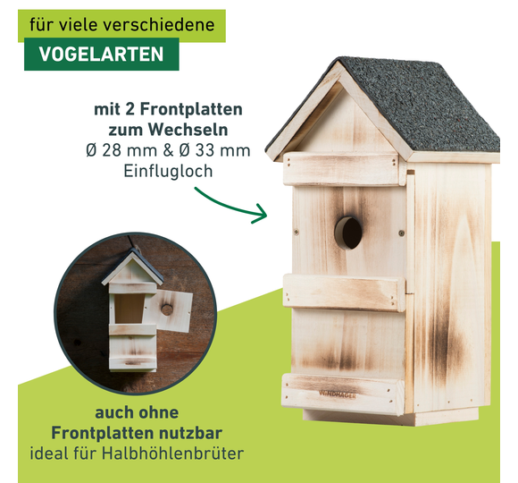 Mit der Frontplatte mit Ø 28 mm großem Einflugloch finden Blau-, Hauben-, und Tannenmeisen einen sicheren Platz, geschützt vor größeren Vögeln, welche häufig Nesträuber sind. Die Frontplatte mit Ø 33 mm großen Einflugloch bietet größeren Vögeln, wie z. B. dem Kleiber, der Kohlmeise oder dem Gartenrotschwanz, ein Quartier. Zaunkönig, Bachstelze und Rotkehlchen hingegen sind Halbhöhlenbrüter, sie nutzen den Nistkasten ohne Frontplatte, um ihren Nachwuchs großzuziehen.