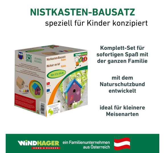 Dieser Nistkasten-Bausatz für Kinder ist ein kreatives Bastelprojekt mit Sinn. In dem kleinen Haus können Vogelfamilien in Ruhe ihren Nachwuchs aufziehen. Das Ø 28 mm Einflugloch ist für Blau-, Hauben-, und Tannenmeisen geeignet. Alle Bauteile aus Holz sind mit Inbusschlüssel und etwas Handkraft leicht zusammengesetzt. Anschließend kann das Haus mit den vier im Set enthaltenen Farben nach Lust und Laune bunt gemalt werden. Mit den ausschneidbaren Schablonen lässt sich das Haus außerdem durch einen kleinen Vogel, eine Blume, ein Blatt oder Herz verschönern. Die rückseitige Hängevorrichtung ermöglicht das Aufhängen des Nistkastens. Der ideale Standort ist ein ruhiger Platz in der Nähe von Büschen und Bäumen. Der Bausatz ist für Kinder ab 3 Jahren geeignet und ein ideales Bastelprojekt, um von Anfang an Bewusstsein für die Natur und ihre Tiere zu schaffen.