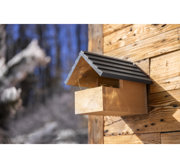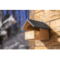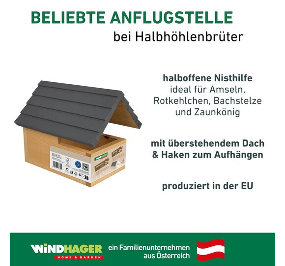 Nicht alle Gartenvögel brüten in geschlossenen Nisthöhlen mit kleinem Einflugloch. Viele Arten wie z. B. Amseln, Zaunkönige, Bachstelzen und Grauschnäppper bevorzugen Spalten und Nischen. Der Nistkasten "Loggia" ist díesem natürlichen Brutplatz nachempfunden: ein solides Holzhaus, das nach vorne hin zur Hälfte offen aber gänzlich überdacht ist. So sind Eltern und Jungvögel gut geschützt. An der Rückseite befindet sich ein Haken, damit es an einem sicheren Ort gut befestigt werden kann.