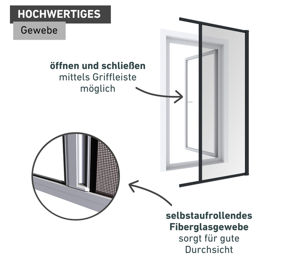 Das Rollo ist individuell zuschneidbar, das reißfeste Fiberglasgewebe hält Stechmücken, Fliegen oder Wespen zuverlässig aus Ihren vier Wänden fern. Spezielle Anti-Windbürste fixiert das Fiberglasgewebe auch bei starkem Winddruck sicher in der Führungsschiene.