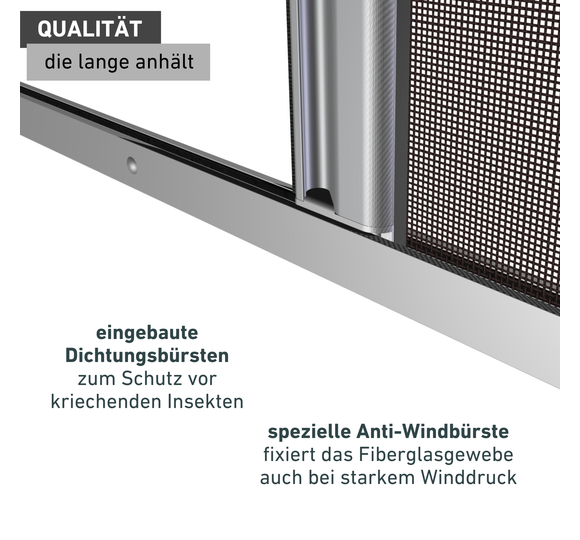 - STABILER KOMPLETTBAUSATZ AUS ALUMINIUM - Pulverbeschichtete Führungsschienen in matter Optik. Reißfestes Fiberglasgewebe für gute Durchsicht. Rollokassette mit Aufrollfeder, die das Gewebe automatisch einzieht. Dichtungsbürsten zum Schutz vor kriechenden Insekten. Alle Teile sind kürzbar.