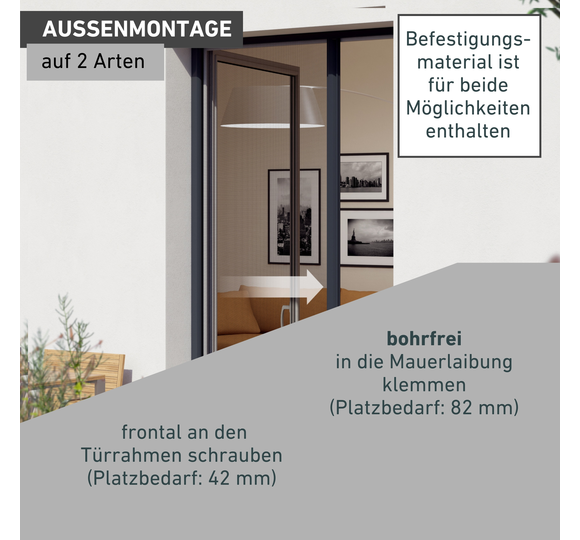 - AUßENMONTAGE AUF 2 ARTEN - Bohrfrei in die Mauerlaibung klemmen (Platzbedarf: 82 mm). Frontal an den Türrahmen schrauben (Platzbedarf: 42 mm). Befestigungsmaterial enthalten.