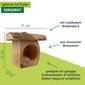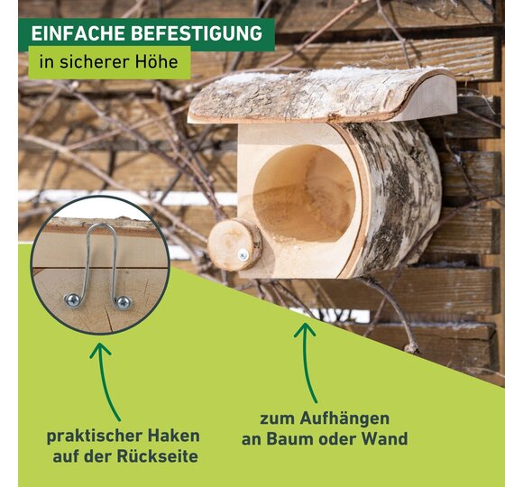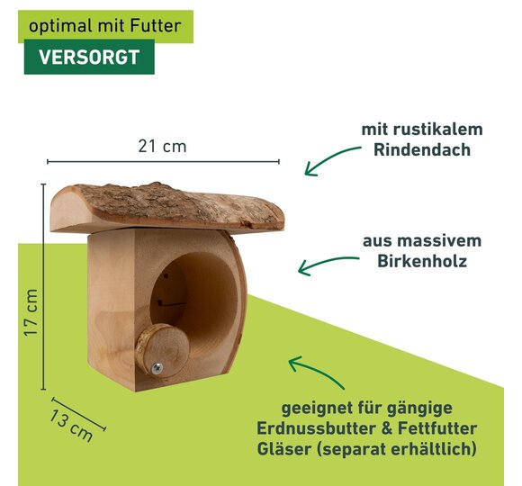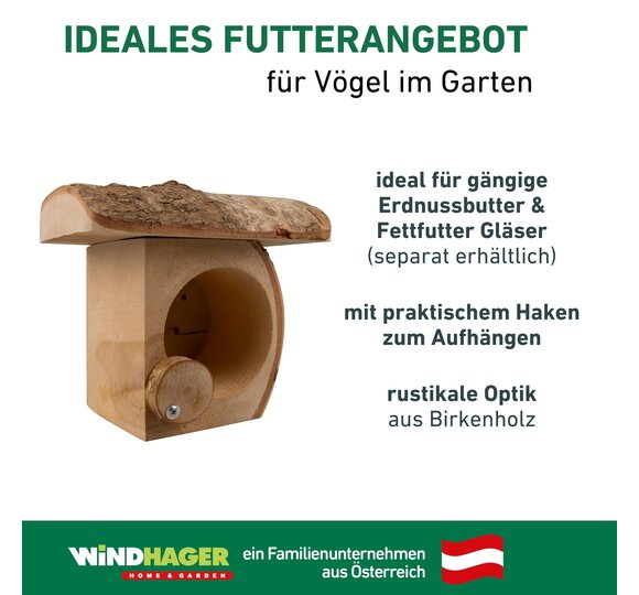 Gegen Winter wird es für Vögel schwieriger, Futter zu finden. Mit dem Windhager "Erdnussbutterglas-Halter" kann man den gefiederten Besuchern schmackhafte Erdnussbutter zur Verfügung stellen. Das Häuschen aus hellem Birkenholz hat ein naturbelassenes Rindendach. Dank Hängehaken auf der Rückseite ist es schnell an einer Mauer, einem Zaun oder Baum befestigt. Ein passendes Erdnussbutterglas (ohne Deckel) wird einfach unters Dach geschoben, so ist der Inhalt gleichzeitig vor Nässe geschützt. Die Futterstelle lässt sich bequem immer wieder neu befüllen.