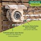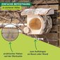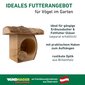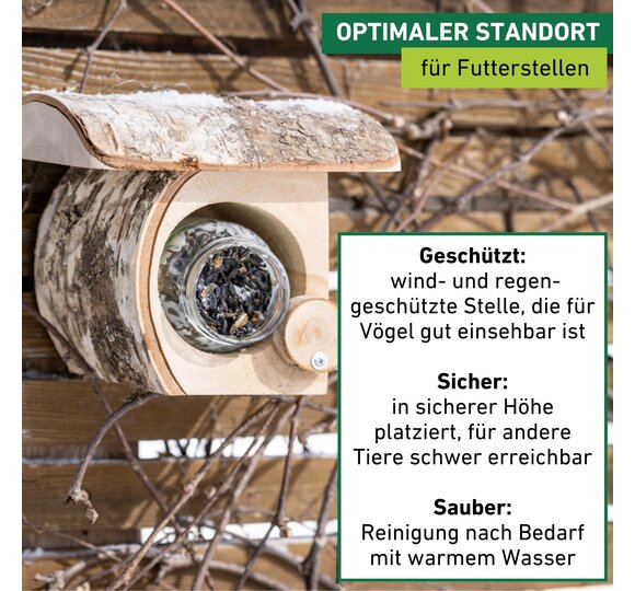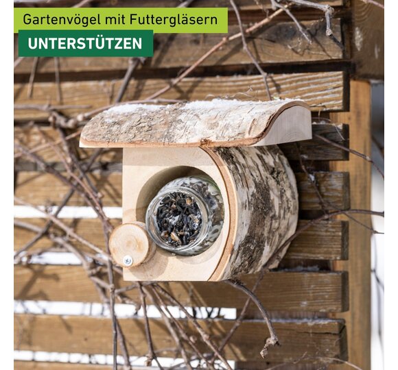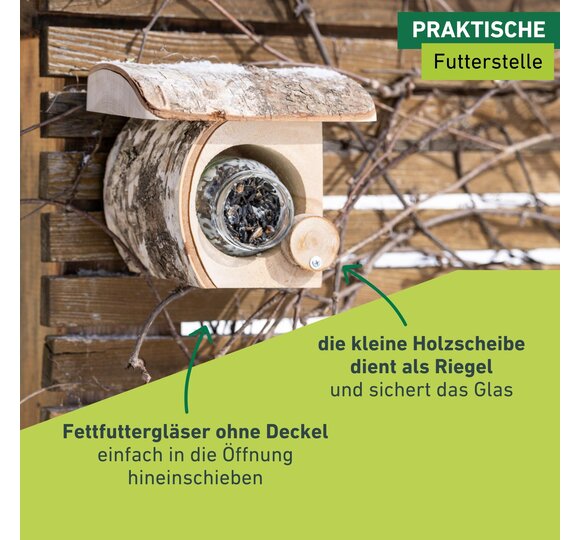 - PRAKTISCH – Fettfutter-Gläser ohne Deckel werden einfach hineingeschoben. Eine kleine Holzscheibe dient als Riegel und sichert das Glas.